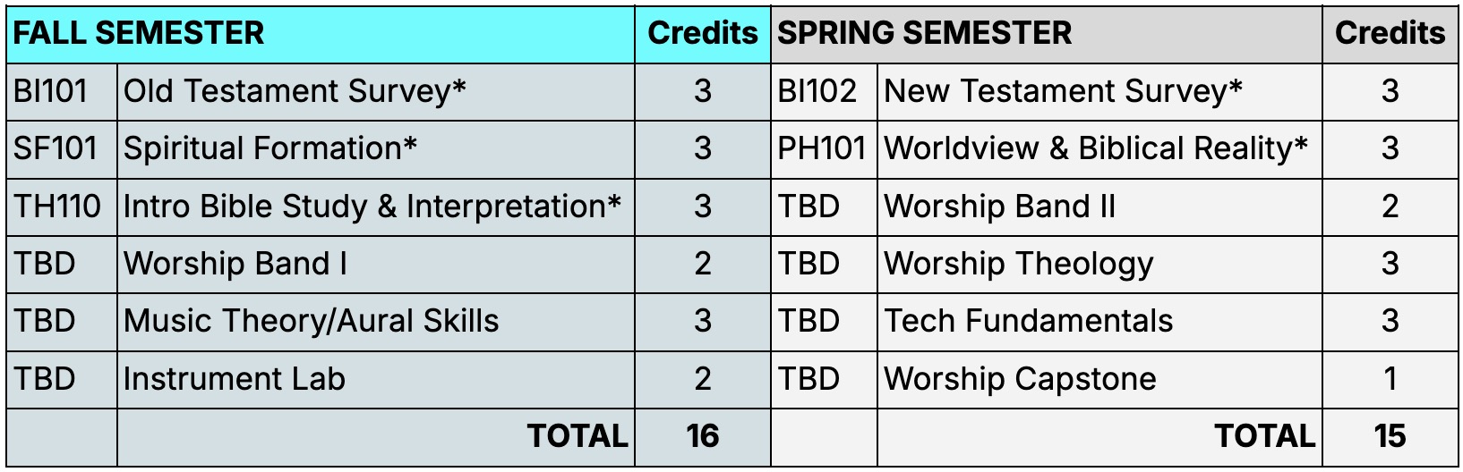 The Certificate of Biblical Worship program provides a one-year introduction to the musical and spiritual elements of Worship ministry. This certificate is designed to be a launching pad for those desiring to serve in worship ministry, grounding the student in a knowledge of theology, music theory and tech fundamentals. Those who complete the program and desire to continue on at PBC toward a Certificate or Associates of Christian Ministry will have earned 15 Credits toward that program.